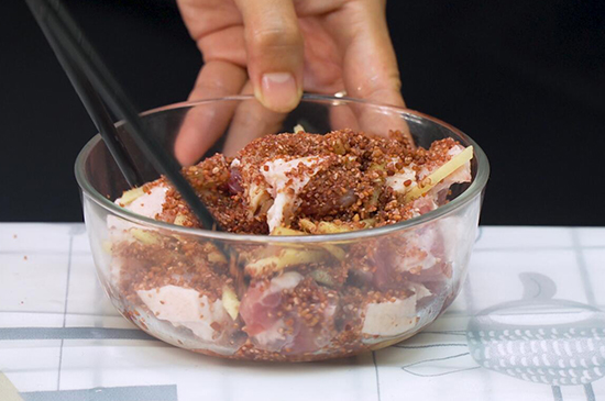 2、放入蒸肉粉,加入少许清水搅拌均匀,将五花肉腌制15分钟。