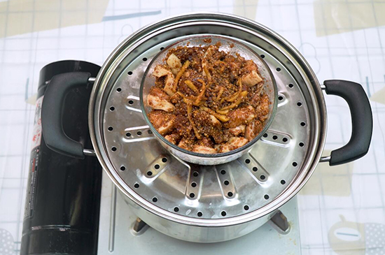3、起锅烧水,水开后将粉蒸肉碗放在蒸锅中,大火蒸制30分钟。