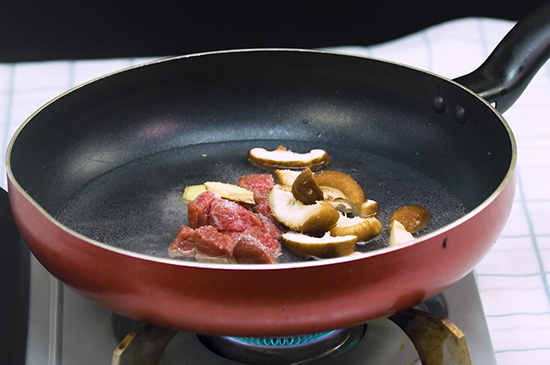 1、首先将洗好的牛肉切成小块,将其放入锅中,再放香菇、生姜片,加入食盐煮熟。