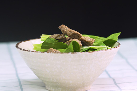 3、将出水过的手工面放在碗底,在上面放上香菜和青菜,将牛肉和香菇放在面上,用牛肉汤浇一圈后,浇上辣椒油和葱花,这样香辣可口的牛肉面就做好了。