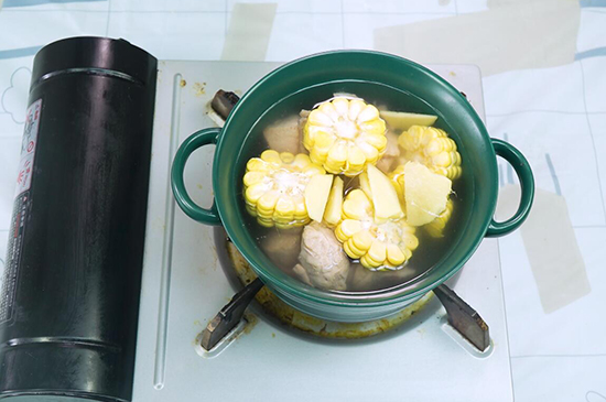 2、再将焯水的排骨和洗好的玉米一起放入砂罐中,倒入适量的清水和生姜片,用小火炖制2个小时。