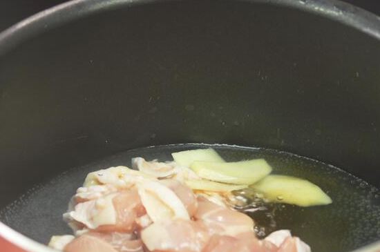 1、首先将鸡块放入锅中,在里面加入适量的生姜、料酒后去腥,同时还要去除里面的血水。