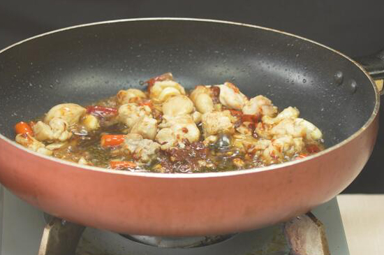 2、在锅中倒入适量的油,加入姜,蒜、辣椒、胡椒粉,豆瓣酱等,将焯过水的鸡块放入锅中翻炒,放入酱油,料酒,加入热水与鸡块持平。