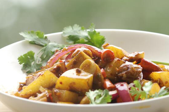 3、再放入一些土豆、白糖,鸡精,盐、桂皮、孜然、料酒后,盖上锅盖,用小火焖煮半个小时,放入洋葱后炒均匀后,就可以出锅装盘,这样香辣可口的大盘鸡就做成了。