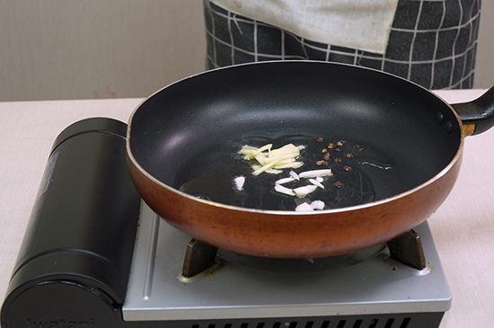 2、在锅中放入油后,将姜蒜、花椒倒入其中,之后放入1勺豆瓣酱,将肉末倒入锅中后炒熟。