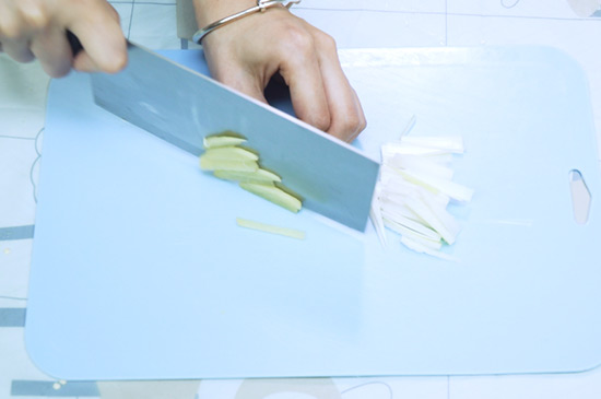1、先将青椒和葱姜切开备用,鸡蛋打散,加盐后搅拌均匀。