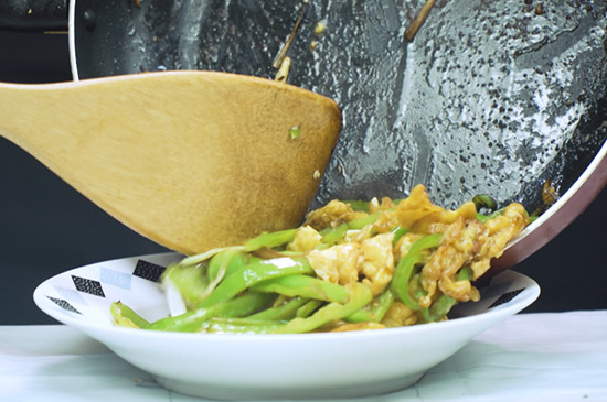 3、另起锅烧油,将切好的青椒和葱姜放入锅中爆炒,再加入鸡蛋后一起翻炒,加入适量的盐和生抽,这样香辣可口的青椒鸡蛋就可以出锅了。