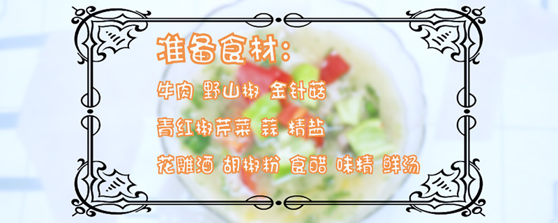 准备食材:牛肉、野山椒、金针菇、青红椒、芹菜、蒜、精盐、花雕酒、胡椒粉、食醋、味精、鲜汤等