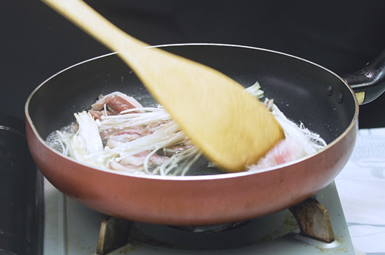 2、起锅烧水,水烧开后前后放入处理好的牛肉片和金针菇焯水几分钟,再用碗盛好备用。