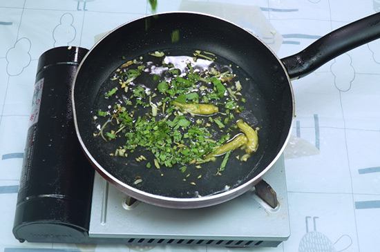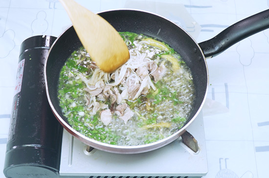 3、另起锅烧油,放入适量的姜、蒜后炒香,放入适量的野山椒、花雕酒、放入鲜汤后,放入芹菜后盖锅。