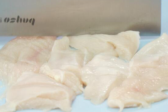 1、首先将鸡肉洗干净后切成片,再用刀背在鸡肉上敲打半分钟,使鸡肉松懈。