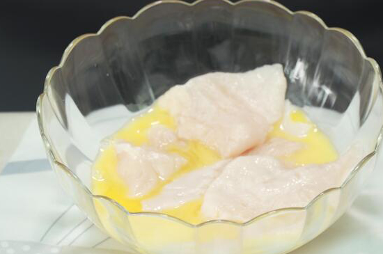 2、将其放在加盐和鸡蛋液的混合液中搅拌,再放入适量的淀粉抓匀后腌制一个小时左右。