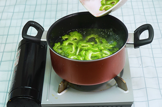 2、锅中烧水,水开后放入苦瓜片烫5秒后捞出过凉水,装入盘中备用。