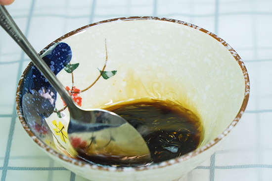 3、将食盐、酱油、鸡精、香醋和香油倒在小碗中,搅拌均匀。
