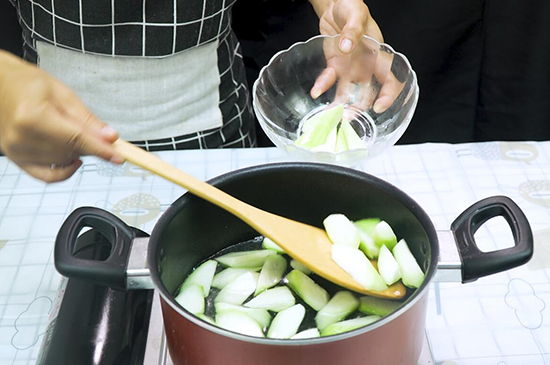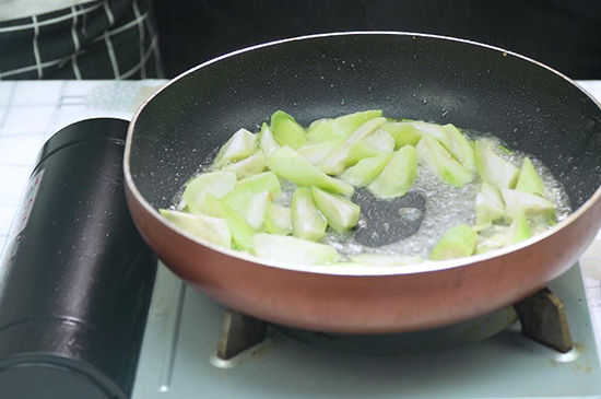 4、锅留底油,放入葱姜末爆香,加入丝瓜和食盐翻炒均匀。