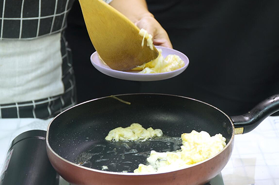 3、锅中放油,将鸡蛋快速划炒熟后盛出备用。