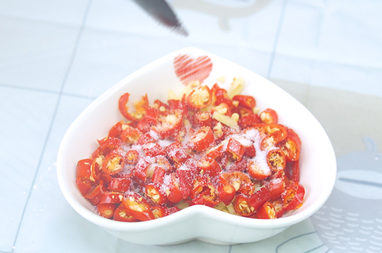 制作辣椒酱时,需要将辣椒和生姜一起剁碎,放在碗中备用。在碗中加入食盐,用筷子搅拌均匀后腌制30分钟,将腌好的辣椒放在锅中熬制10分钟,之后拌入白糖,放凉后盛入玻璃瓶中密封保存,一周后便可以食用。