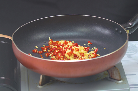 1、将红辣椒和生姜清洗干净,一起用刀切碎,放在碗中备用。