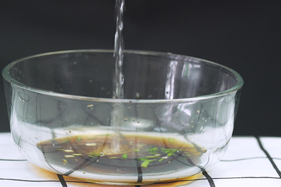 2、将少许耗油、食盐、香醋、酱油、白糖、味精、小葱碎放在小碗中,加入少许清水调成汁。