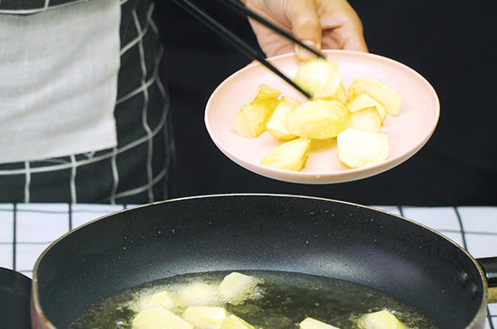 3、锅中烧足够的油,将土豆下锅油炸至表面金黄后捞出,将茄子和青椒下锅炸软后捞出。