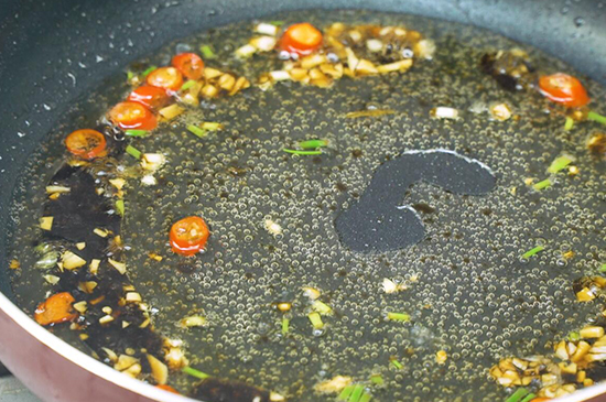 4、锅留底油,放入小米辣、蒜末翻炒几下,加入调好的汁开大火烧开。