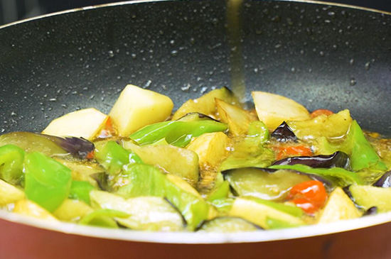 5、将炸好的土豆、茄子和青椒翻炒均匀,淋入香油,美味的地三鲜便可以出锅装盘。
