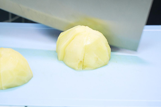 1、将土豆、牛腩切块,牛腩焯水后作为备用,番茄放入热水中浸泡,把表面的皮撕掉后切成块状。