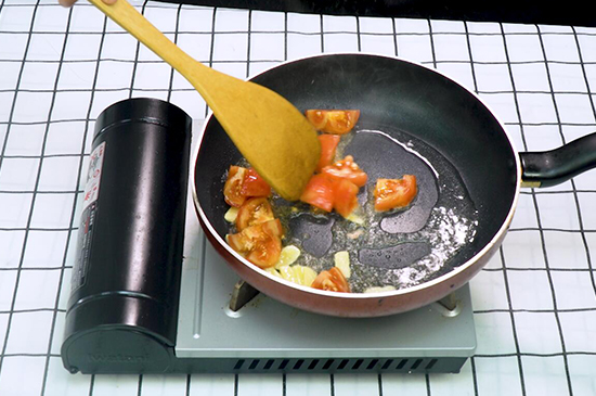 2、起锅烧油放入姜片,炒出香味后放入番茄,直至翻炒出番茄汁。