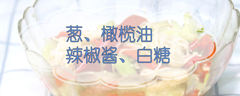 准备食材:金针菇、黄瓜、红椒、醋、蒜、葱、橄榄油、辣椒酱、白糖。
