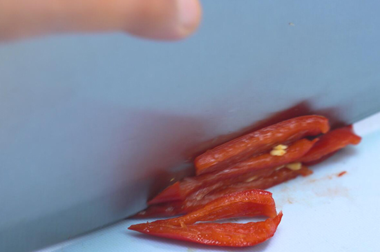 1、用剪刀将金针菇的根蒂剪去并反复清洗干净,红椒去籽切丝以作备用。