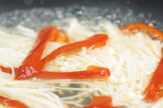 2、起锅烧水并加入一勺盐,水烧开后放入金针菇和红椒丝煮1分钟立即关火。