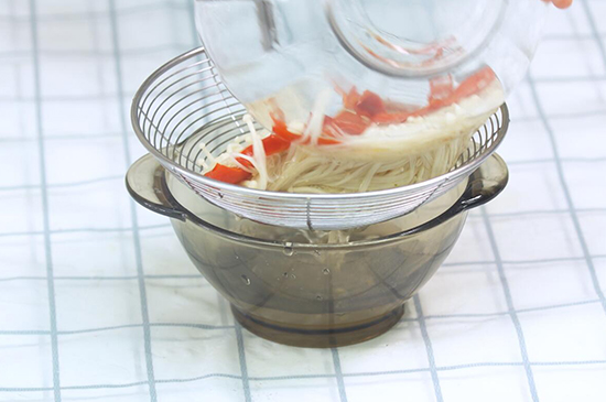 3、把煮好金针菇和红椒丝进入凉开水中,冷却后捞起沥干水分。
