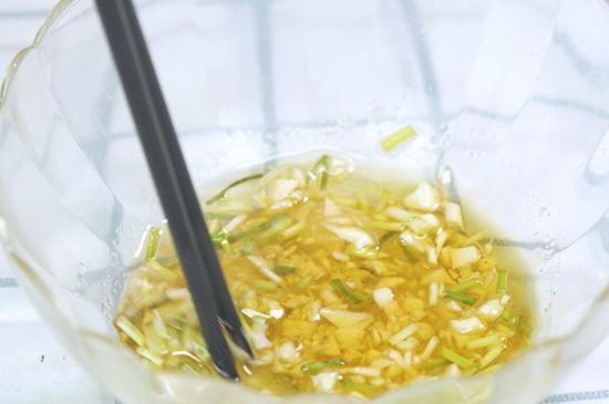 4、将蒜和葱切成末后,与适量香醋、橄榄油和糖调制成汁,再把黄瓜去皮切丝作为备用。