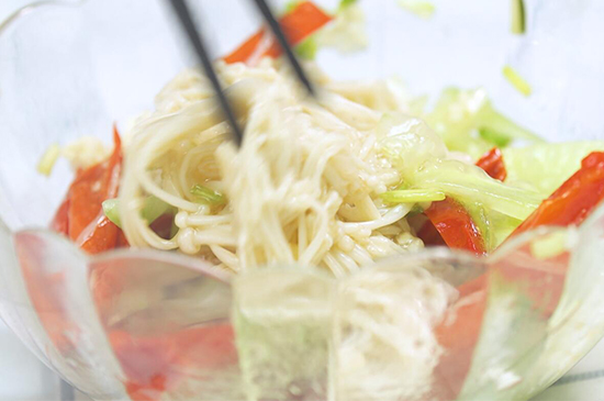 5、最后将金针菇、红椒丝、黄瓜丝以及调好的汁搅拌均匀,即可做成一份美味爽口的凉拌金针菇。