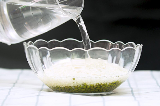 1、在碗中放入适量绿豆和大米,加水至没过大米后,淘洗浸泡2小时左右。
