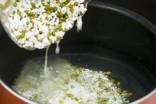 2、往锅内倒入适量清水,再把处理好的大米和绿豆倒入。