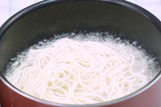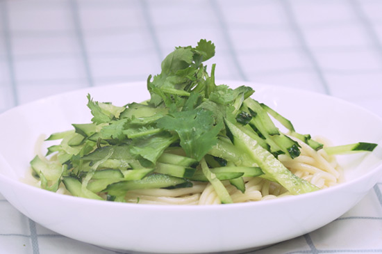 1、将香菜、黄瓜洗净切好,热干面下锅煮软作为备用。