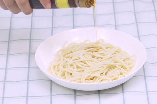 2、煮好的热干面立即捞出用凉水冷却,往上面淋上适量香油,加适量的盐和醋。