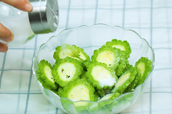 1、将苦瓜清洗干净切成片状,再用盐腌制15分钟左右挤掉涩水可以去除苦味。