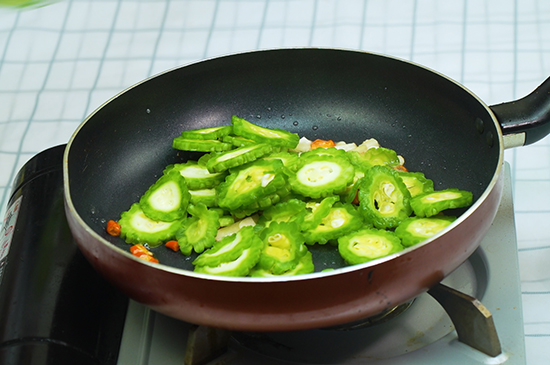 切好的苦瓜先用盐腌制15分钟,把切好的生姜、朝天椒、蒜头放入油锅内炒出香味后,再将腌制好的苦瓜放入翻炒至软度适中,并加入生抽炒拌出色泽,最后沿着锅边加一点开水继续翻炒至熟透,清脆爽口的清炒苦瓜就可以制作完成。