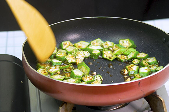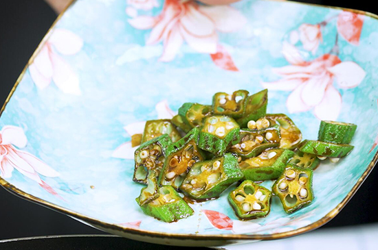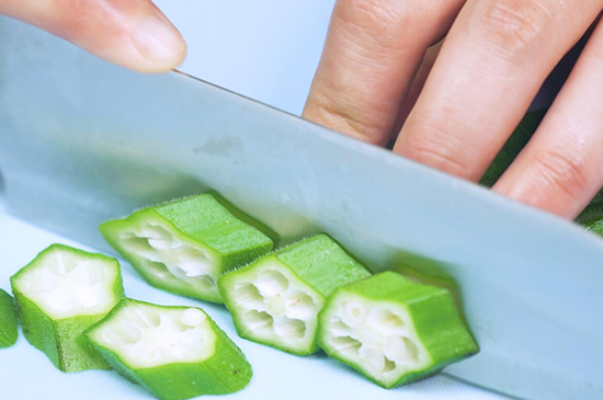 将秋葵洗净斜切成段,蒜瓣切碎成粒以作备用,再把盐、老抽、生抽、醋、糖加水调制成汁,往加油烧热的锅内放入蒜末炒出香味后,把秋葵和汁倒入翻炒均匀至收汁,就可以装盘食用。