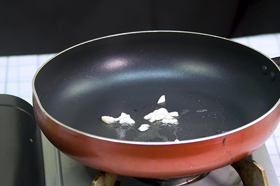 3、起锅倒入适量油烧热,再放入蒜末炒出香味。