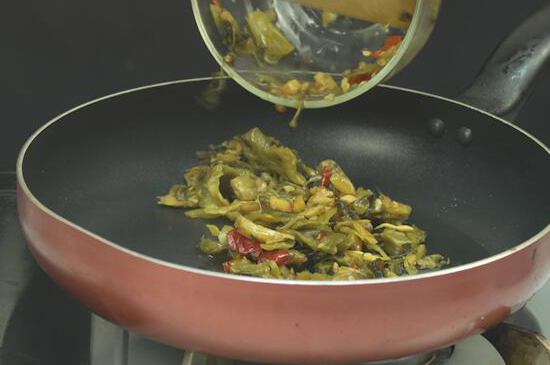 3、往锅内倒入少量油并放入酸菜炒干作为备用。