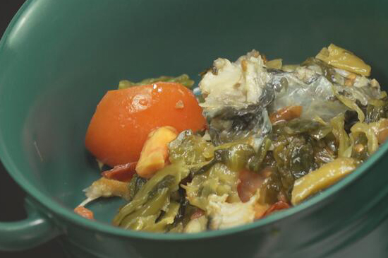 5、将汤汁留于锅内,锅内食物全部捞出放于碗中铺底,再把鱼片放入锅内汤汁煮30~60秒。