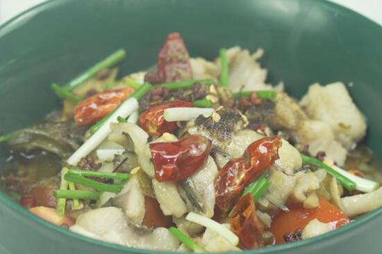 6、最后把鱼片捞出放入碗内,撒上干辣椒、胡椒粉、小葱、花椒后,再另起锅烧油至6成热浇在上面,美味可口的酸菜鱼就出锅了。