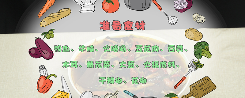 准备食材:鸭血、牛腩、火腿肠、五花肉、豆芽、木耳、黄花菜、大葱、火锅底料、干辣椒、花椒。