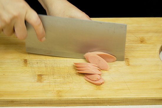 1、火腿肠切片,五花肉洗净切片,小葱切段,干辣椒切段,鸭血切片放入沸水焯烫片刻捞出备用。