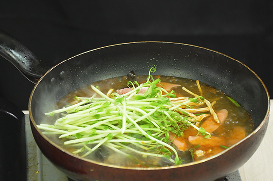火锅底料放入锅内加水煮沸后,加入小葱、牛腩、火腿肠、肉片、木耳、黄花菜、豆芽、鸭血,煮熟后倒入盘内,最后将烧好的热油浇入盘内,美味的家常毛血旺就完成了。