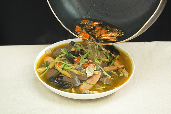 4、最后将热油浇入碗内,美味的家常毛血旺就做好了。