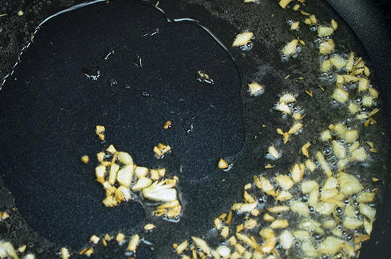2、将蒜切成蒜蓉形状,放入油锅小火炸至金黄捞出。